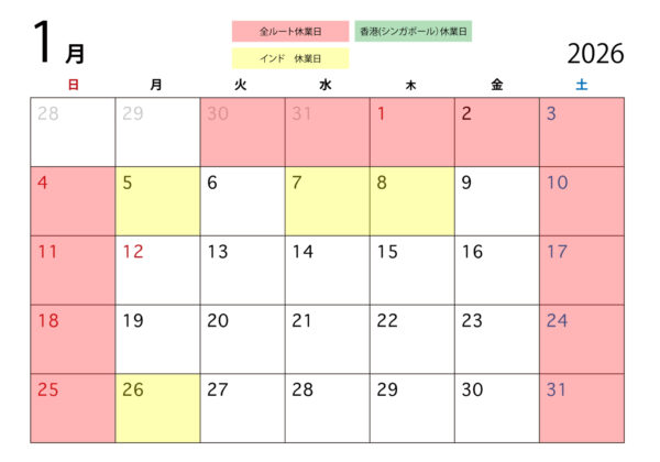 2026年1月の休業日程 (コロナ、年末年始休業含む)