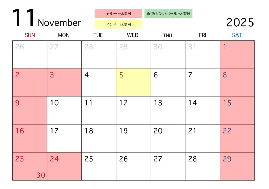 2025年11月の休業日程 (新型コロナによる休業含む)